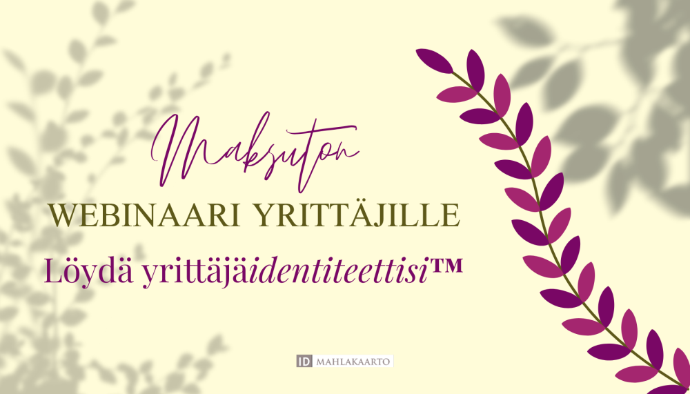 Varaa paikkasi maksuttomaan webinaariin ja aloita kirkastaminen siitä, mikä todella ohjaa yrittäjyyttäsi. Tervetuloa tilaan, jossa identiteettityö ja yrittäjyys kohtaavat.